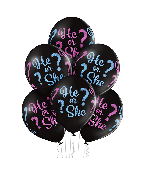 6 stk. Lateksballonger dedikert til kjønnsavsløring av baby. Kommer i sort pastellfarge med «He or She?» tekst og dekorasjoner av spørsmålstegn. Ballongene kan bli opptil 30cm store når de blåses opp. Passer perfekt til å avsløre nyheten om hvilket kjønn babyen som er på vei har. Alle våre lateksballonger er nedbrytbare i naturen på lik linje med eksempelvis eikeblader.