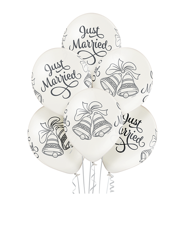 Lateksballonger (6stk): «Just Married» & Bryllupsklokker – 30cm – Pearl (Metallic)