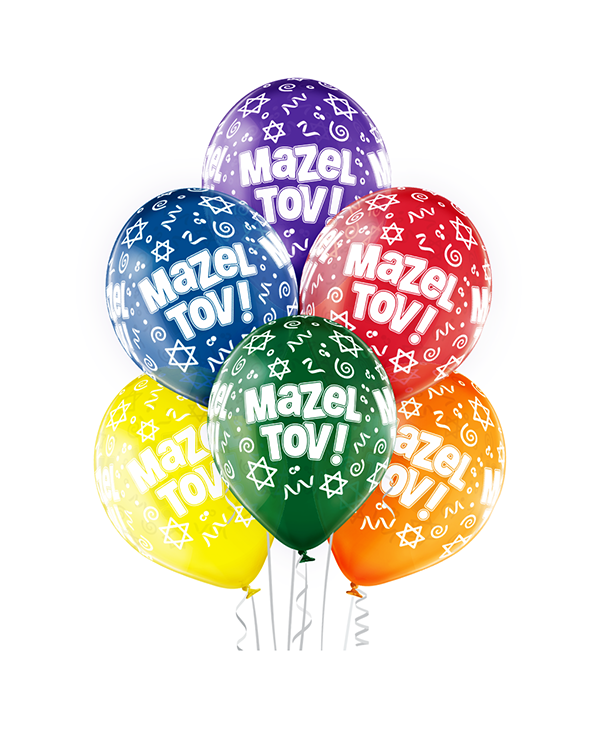 6 stk. Lateksballonger dekorert med Davidsstjernen og teksten «Mazel Tov» i hvit tekst. Ballongene kommer i seks forskjellige transparente farger: Grønn, gul, oransje, «Royal Red», «Quartz Purple og blå. Ballongene kan bli opptil 30cm store når de blåses opp. Fine ballonger å bruke til uttrykke gratulasjon i forbindelse med en gledelig hendelse eller markant feiring. Alle våre lateksballonger er nedbrytbare i naturen på lik linje med eksempelvis eikeblader.