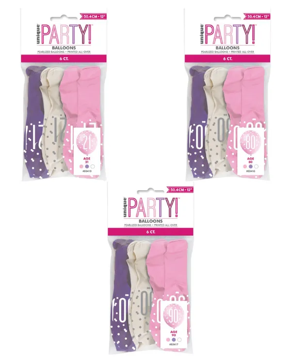 6 stk. Lateksballonger som kommer i rosa og sølv med forskjellig tall. Settet kommer i tre forskjellige bakgrunnsfarger. Ballongene kan bli opptil 30cm store når de blåses opp. Kule ballonger som passer perfekt til bursdags.