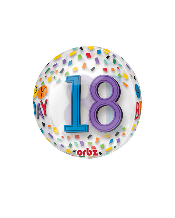 1 stk rund Orbz på 38x40cm. Disse ballongene er helt runde og gir et morsomt utrykk. Ballongen er gjennomsiktig med konfetti i ulike farger og med tallet «18». Passer perfekt til ballongbuketter, dekorasjon til fest eller som gave til en heldig 18-åring. Fyll den med luft eller helium. Bruk gjerne en ballongvekt så den ikke flyr sin vei.
