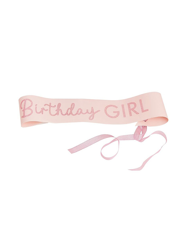 Rosa bånd med teksten «Birthday Girl» i glitter. Gi båndet til bursdagsbarnet så hun føler seg ekstra spesiell på den store dagen.