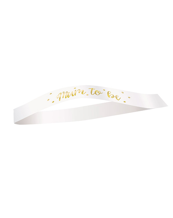 Satengbånd med teksten «Mum to be». Båndet er hvitt og teksten er gull. Perfekt å gi til den blivende moren på babyshower.