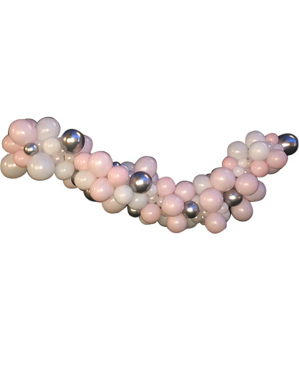Ballongirlander med hvite, rosa og sølvafargede ballonger. Fylles med luft. Perfekt dekorasjon utenfor er bryllup, en grand opening eller noe lignende hvor du trenger litt ekstra pynt. Vi bruker High Float på all vår dekor så de skal vare så lenge som mulig. Vi kan også lage andre girlandere på forespørsel. All vår dekor håndlages for hver gang, og det vil kunne oppstå varisjoner i forhold til det du ser avbildet.