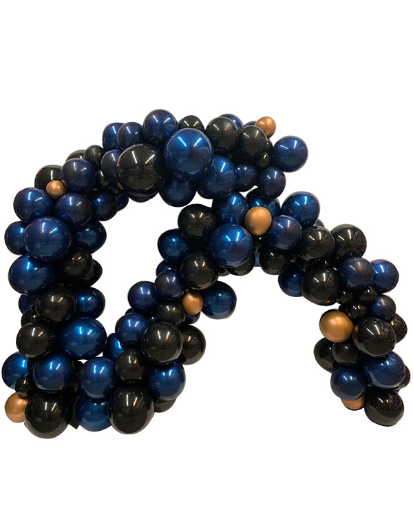 Ballongirlander med blå, svarte og kobberfargede ballonger. Fylles med luft. Perfekt dekorasjon utenfor en fest, en grand opening eller noe lignende hvor du trenger litt ekstra pynt. Vi bruker High Float på all vår dekor så de skal vare så lenge som mulig. Vi kan også lage andre girlandere på forespørsel. All vår dekor håndlages for hver gang, og det vil kunne oppstå varisjoner i forhold til det du ser avbildet.