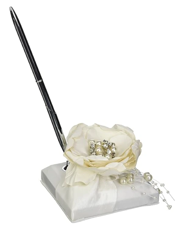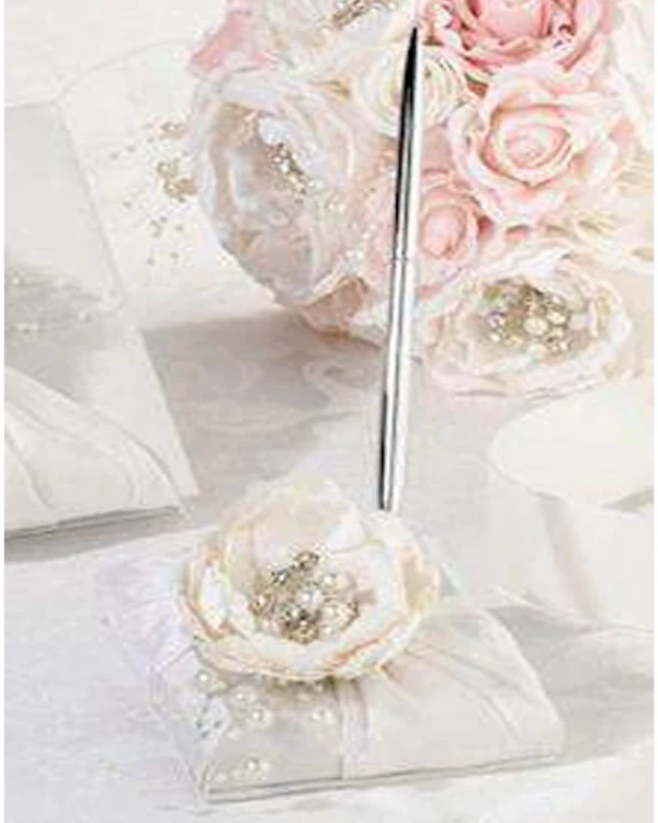 Dette pennsettet inkluderer en sølvpenn med svart blekk festet til en kremsatengdekket base. Den håndlagde papirblomstdekorasjonen med perle/rhinestone ornament i midten og perlespray-aksent vil ikke gå upåaktet hen når gjestene kommer inn i resepsjonen. Basen måler 3,75″.