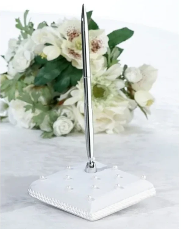 Dette pennsettet inkluderer en sølvpenn med svart blekk festet til en kremsatengdekket base toppet med perler. Den håndlagde papirblomstdekorasjonen med perle/rhinestone ornament i midten og perlespray-aksent vil ikke gå upåaktet hen når gjestene kommer inn i resepsjonen. Basen måler 3,75″.