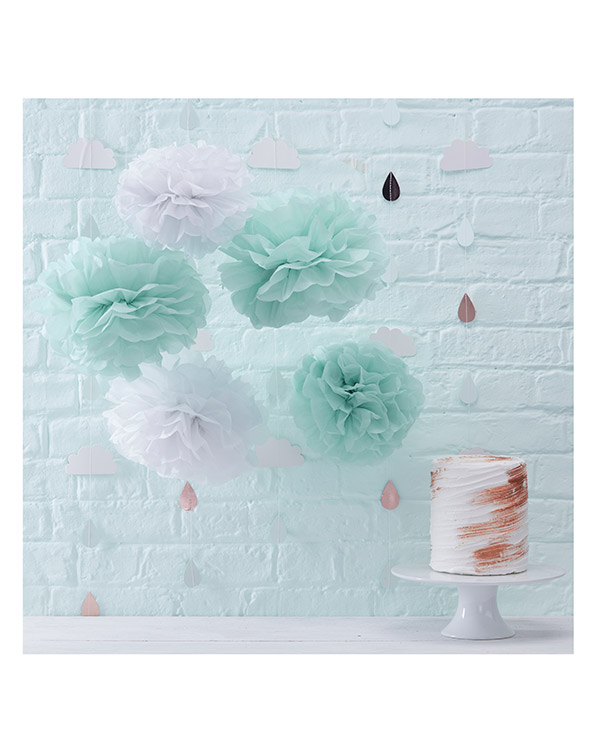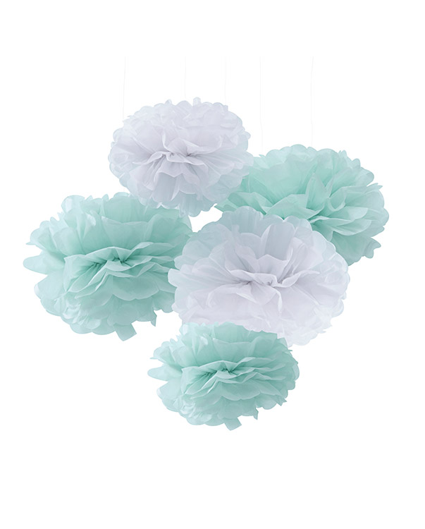 5 stk pompons i mint og hvit i ulike størrelser, 25,5, cm til 32,5 cm. Nydelig pynt på for eksempel en babyshower.