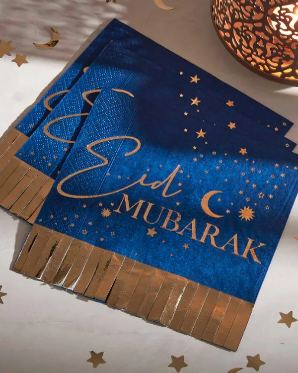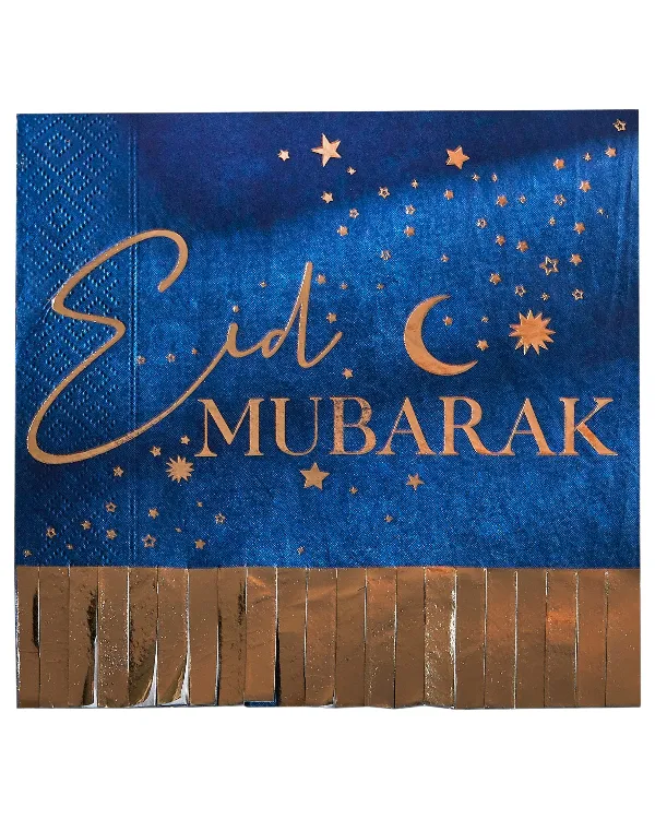Disse vakre serviettene med «Eid mubarak» måne og stjerner i blått er perfekte for å feire Eid. Med en størrelse på 17cm i høyden og 18cm i bredden, er de ideelle for å dekke bordet og legge til en festlig touch til enhver Eid-feiring. Pakken inneholder 16 servietter, slik at du har nok til å imponere gjestene dine. Laget av høykvalitetsmateriale, er disse serviettene både holdbare og absorberende. Gjør Eid-feiringen din enda mer spesiell med disse flotte serviettene!