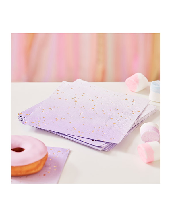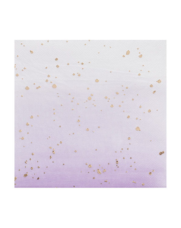 16 stk papirservietter på 16cm. Serviettene er syrinfarget med en lekker ombréeffekt og gullprikker. Perfekt dekorasjon til alle slags festligheter.