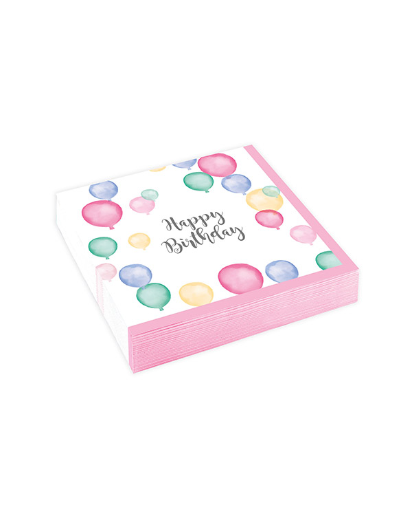 20 stk servietter på 12,5cm med «Happy Birthday» og pastell-ballonger. Lekre servietter til festen. Vi har mye annen pynt med samme tema i nettbutikken, ballonger, tallerkner og mer.