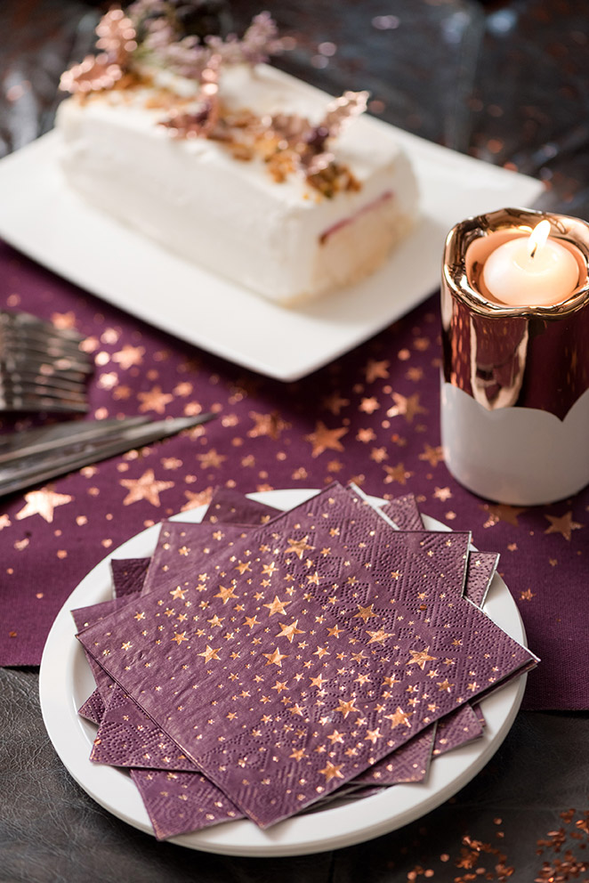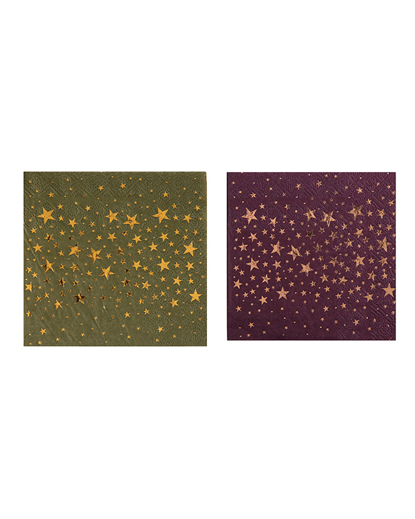 20 stk servietter på 12,5 cm. Kommer i burgunder og grønn med gullstjerner. Perfekt dekorasjon til for eksempel nyttårsaften.