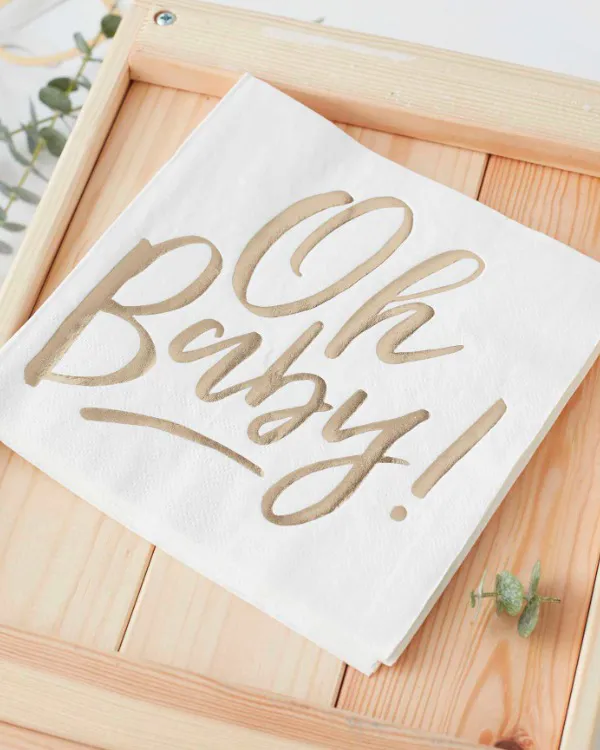 Feir med våre nydelige gullfolierte ‘Oh baby» gullpapirServietterer. Disse søte Servietterene vil gjøre det enkelt å spise velsmakende festmat!