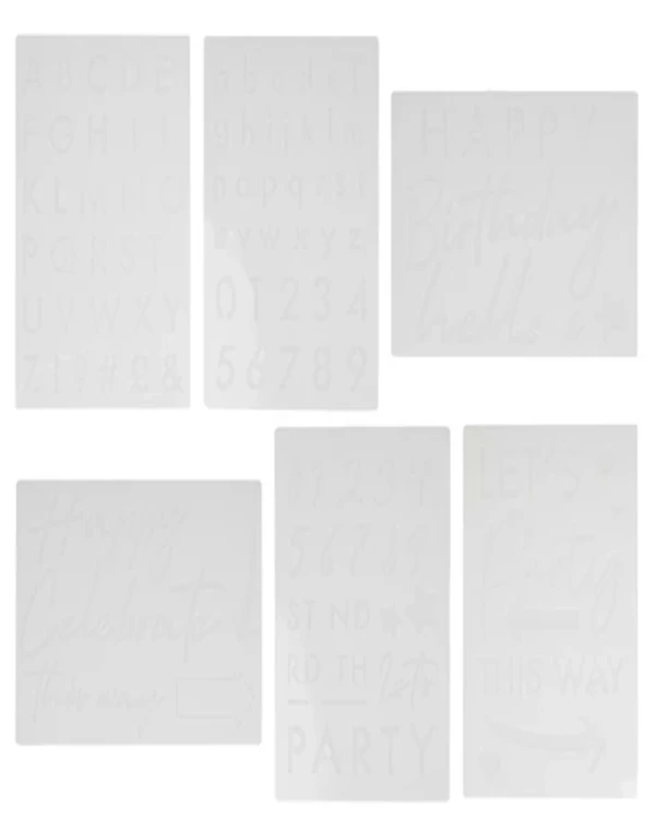 Denne fantastiske bursdagspakken med tall- og bokstavsjablonger er perfekt for å lage tilpassbare skilt. Hver pakke inneholder seks 29,5 x 42 cm sjablonger i en rekke bokstaver, tall, ord, fonter og størrelser, perfekt for å skreddersy skiltet til akkurat det du ønsker.